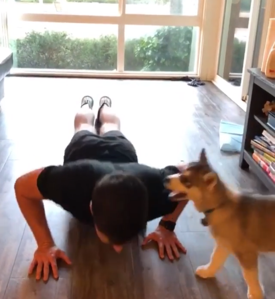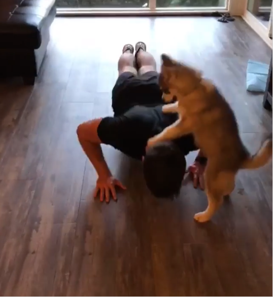 很多人都喜歡去健身房健身,因為有教練監督和指導比較能堅持下來,在家裡其實也能做一些地板運動,就全靠自發自覺了,不過有位網友在家裡做伏地挺身的時候,哈士奇竟然冒充健身教練,在他身上狂壓,好像在說「再下去一點啦!」,畫面十分逗趣。