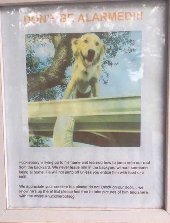 ▼不過這樣的行徑經常嚇到外人,主人奧斯汀乾脆在門口放上標誌「看到哈克貝利在屋頂上別緊張」。