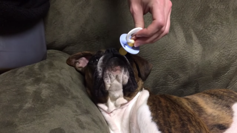 當寶寶哭鬧不止時,很多家長就會將奶嘴放進他們口中,不久之後寶寶就能安靜下來,但是沒想到這一招在狗狗身上同樣適用。雖然下面這隻叫做Leia的狗狗並沒有吵鬧,但是當主人將奶嘴放進牠口中時,牠吸吮片刻後竟然睡著了。