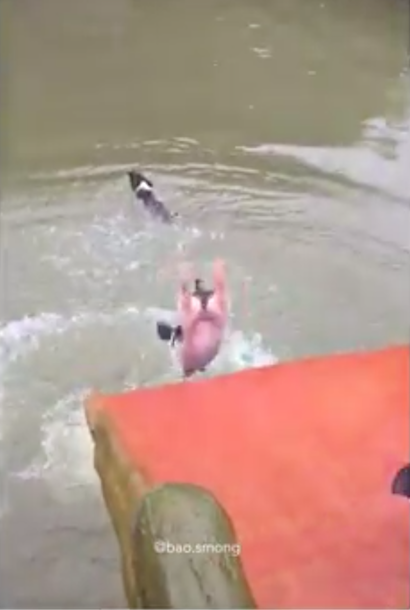 ▼下一隻小豬連忙跟上,也跳了下去。這跳水姿勢不夠專業,但非常可愛啊。