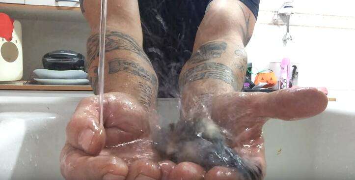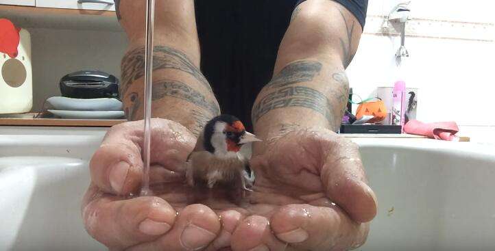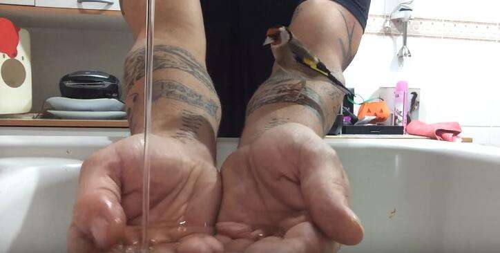 ▼影片中主人打開水龍頭想給鳥兒洗澡,他張開雙手用手掌接水,鳥兒馬上跳上他的手臂就位。