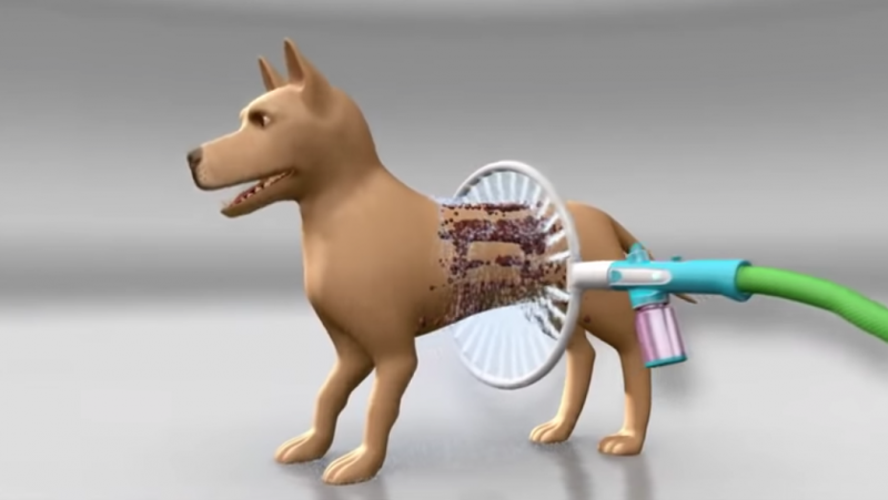 ▼環繞式的噴水裝置能夠減輕狗狗的壓力,讓牠們感覺更加舒適。
