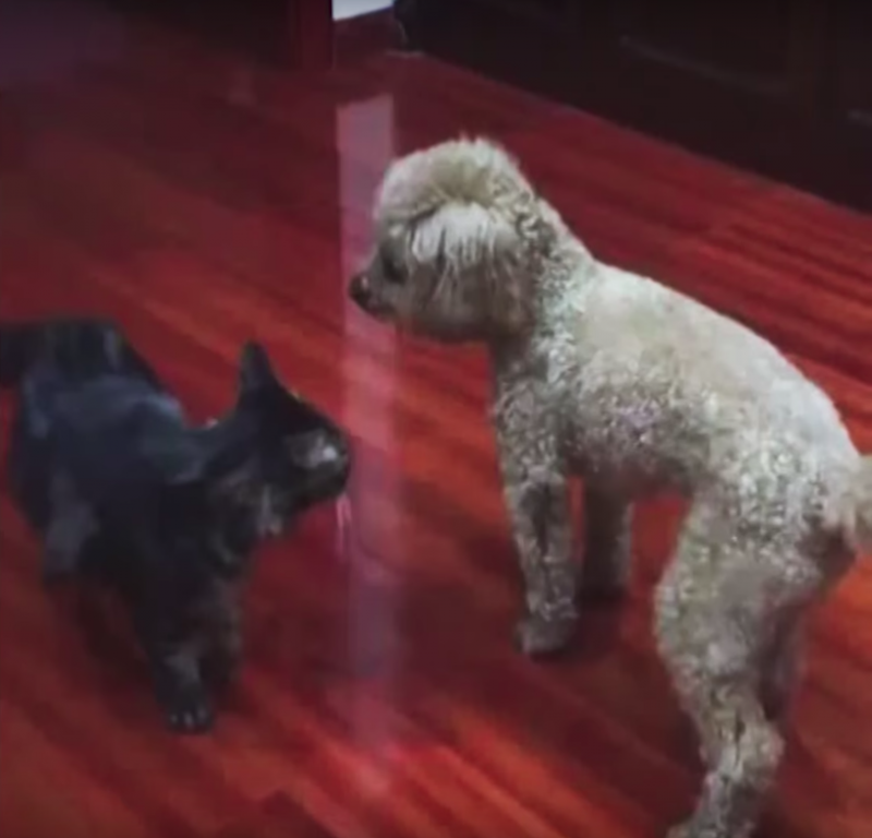 家裡養貓又養狗的毛爸媽,經常能看到歡喜冤家的較量。貓咪靈巧聰慧,狗狗雖然體型比較大,但個性憨直,大多數時候都不是貓咪的對手。下面這隻可愛的貴賓卻打破魔咒,狠狠為狗狗爭了一口氣。