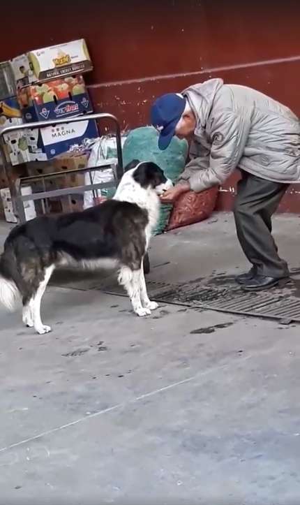 ▼老人貼心的用雙手捧著水給狗狗喝。