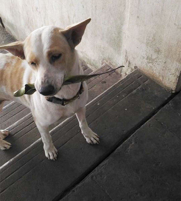 ▼大概覺得吃到美味的飯飯應該報答一下,小白狗每次吃飯都會帶來一些小禮物,交給Orawan後才開動。
