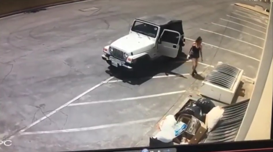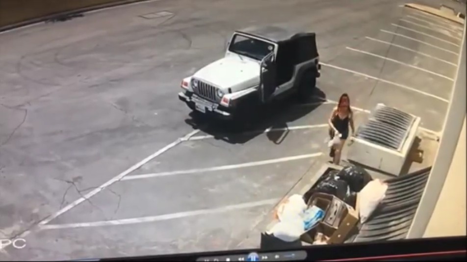 ▼從監視器畫面可以看到,這位名為 Deborah Sue Culwell 的女子,開著一輛吉普車到垃圾桶旁,下車時手上還拿著一個塑膠袋。