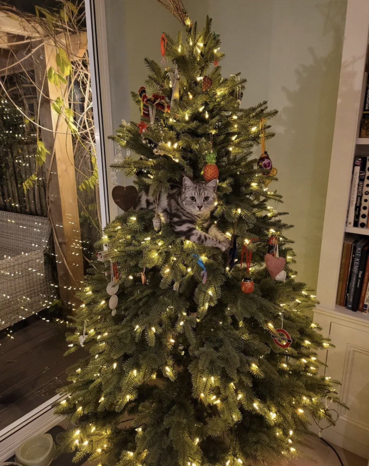 聖誕節到來,很多人喜歡在家中擺放聖誕樹,再掛上各種各樣的飾品,增添節日氣氛。但家中有貓咪的話,聖誕樹的「生存期」可能會大大縮短,因為對喵星人來說,聖誕樹就是「貓樹」。牠們可以爬上爬下、咬葉子、抓飾品,玩得不亦樂乎。推主@markmleach分享了自家聖誕樹被貓咪佔領的照片,問:「推特上的貓友們,大家聖誕節都有遇到這樣的問題嗎?」