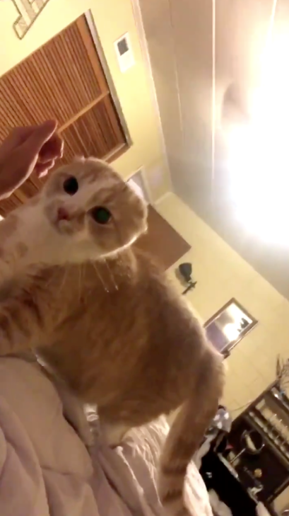 ▼看到慢慢後退的貓咪,主人簡直快要笑瘋了,於是她伸出手摸了摸貓咪的臉孔,沒想到貓咪竟然嚇得後退了幾步!