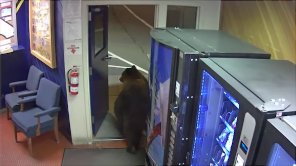 這隻大熊一定不餓,否則不會放過自動販賣機裡的食物。警方也打趣說,他們不會搜索這名「嫌犯」。這隻大熊很聰明,還會站起來開門,簡直把警局當成了自己的家啊。