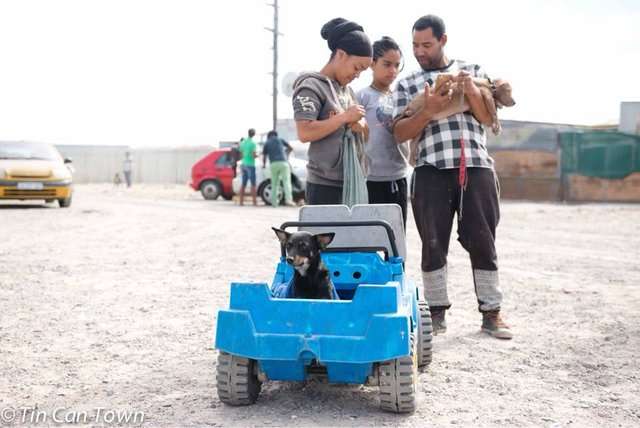 2018年10月12日人在貧困的時候往往自顧不暇,哪有精力去養寵物。但南非開普敦貧民區「布利基斯多普」(Blikkiesdorp)中,卻有一名女子將狗狗當成家人照顧。她家的狗狗剛生下寶寶,她沒有車,就將狗媽媽和寶寶們裝進玩具車,拉著牠們去看獸醫。