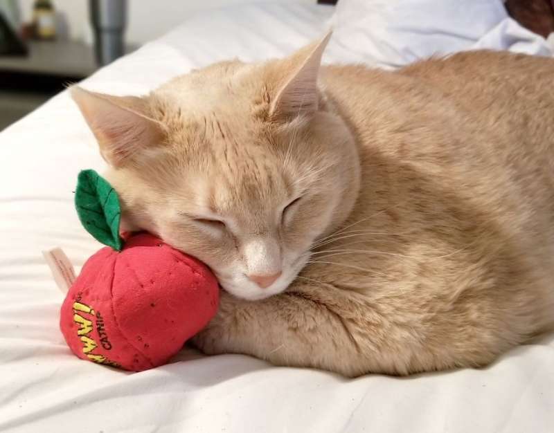 ▼Bronson最愛的玩具,是一個裝有貓薄荷的布番茄。牠經常啃咬、抓撓,這也算簡單的運動啦。