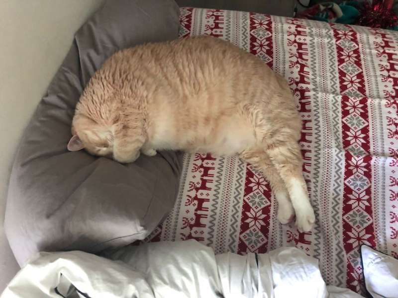 ▼Bronson有很多可愛的習慣,比如枕著枕頭睡覺。