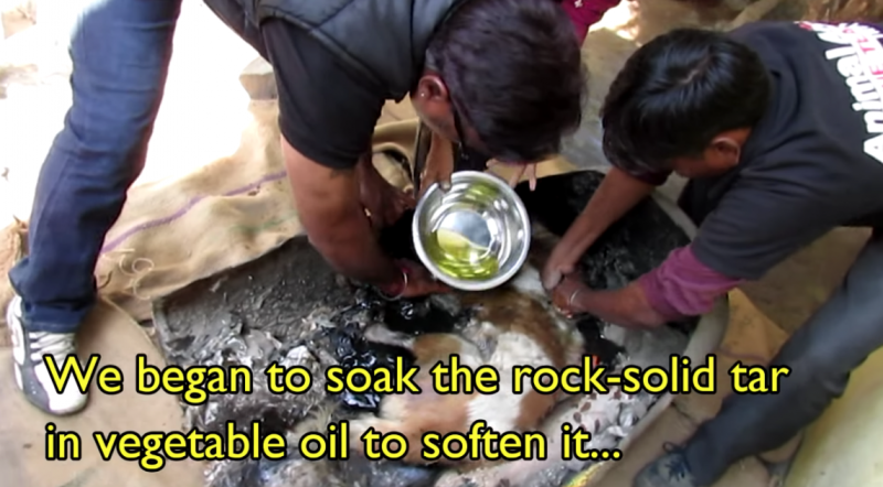 ▼由於裡面都是結成塊的焦油,他們無法當場救出狗狗。
