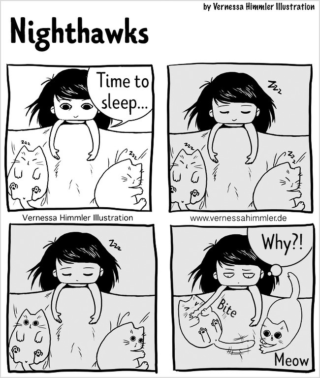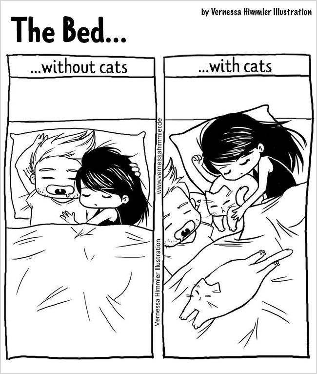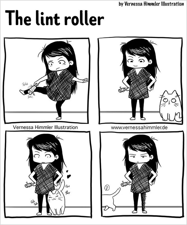 2018年12月11日每個養貓的人都深有體會,儘管喵咪的任性和調皮有時候讓你抓狂,但當擁牠們入懷的那種療癒感是無法替代的,德國藝術家Vernessa Himmler就將對家中兩隻貓咪又愛又恨的感情,用插畫的方式表達出來,也許每個貓奴都能從中找到自己的影子。