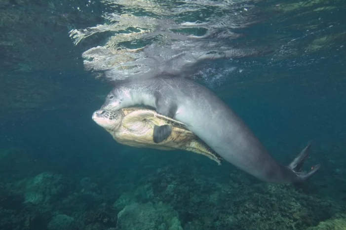 2018年11月25日三歲的小海龜在海裡靜靜躺著不動,在這隻小海龜上方,竟有一隻海豹從上往下緊緊依偎著這隻小海龜,宛如情人般深情擁抱著他。這樣難能可貴的畫面被拍攝下來,照片出自Beat Korner之手。Beat Korner是美國的攝影師,他時常在夏威夷海域從事海中攝影,某日就在海裡捕捉到這樣的奇景。