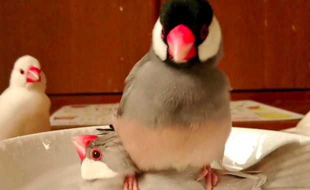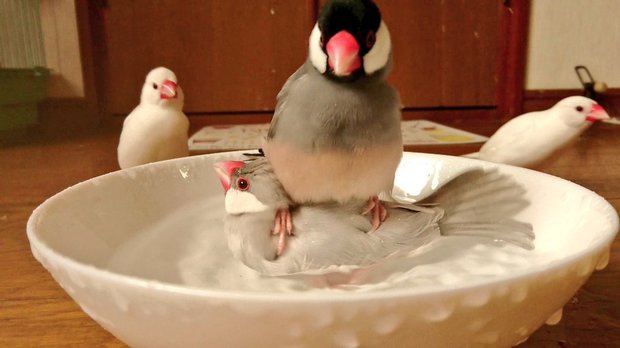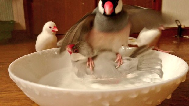 ▼他養的幾隻文鳥平日裡相處的還算融洽,他經常會放一盆水,讓鳥們能在裡面泡泡水,嬉戲一下。誰知道有一次一隻小屁鳥趁別的鳥在泡水的時候,突然騎到人家身上,畫面太好笑了。
