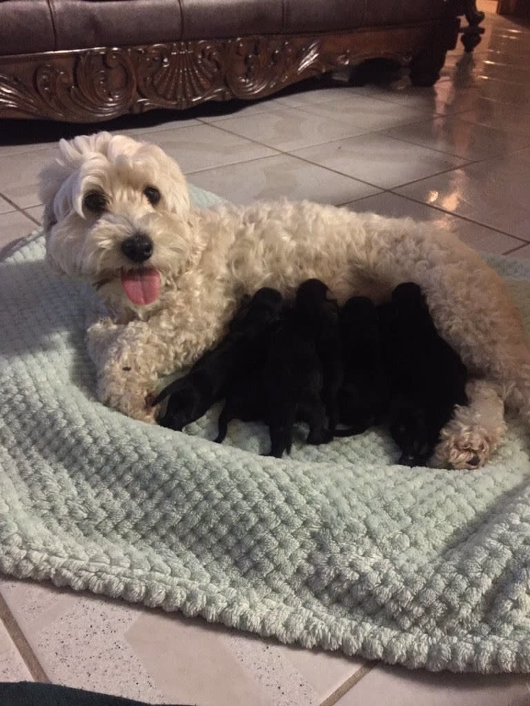 ▼Jacqueline家中有一隻叫做Mocca的小母狗,不久前牠與另一隻白色小狗相遇,很快陷入愛河。兩隻狗狗整天在一起玩,兩個星期後Mocca就懷孕了。