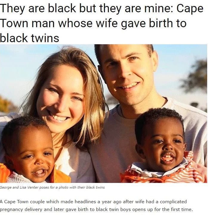 ▼不過也有人堅信Mocca是清白的,畢竟人類世界也發生過這種狗血情節。下面這對白人夫婦就生出了黑人寶寶。還有人從生物學角度論證了白毛狗狗生出黑毛狗狗的可能性。