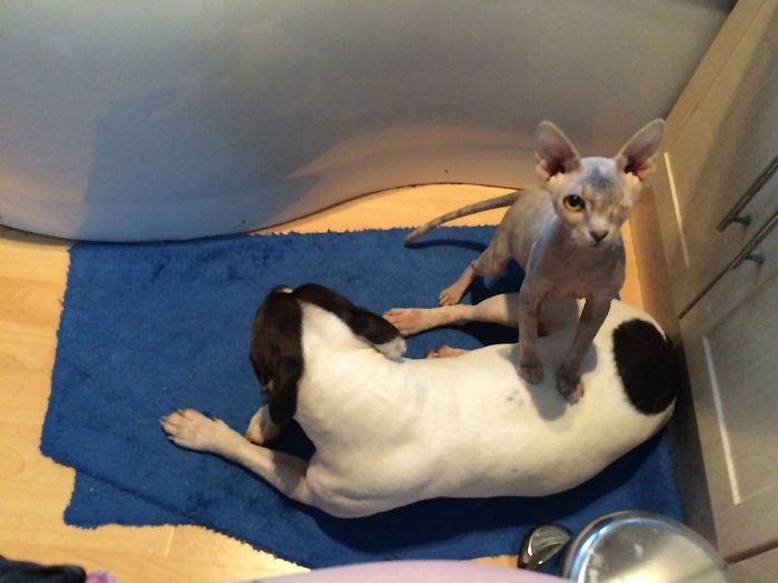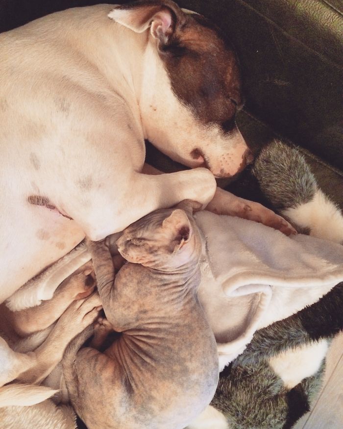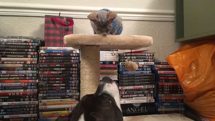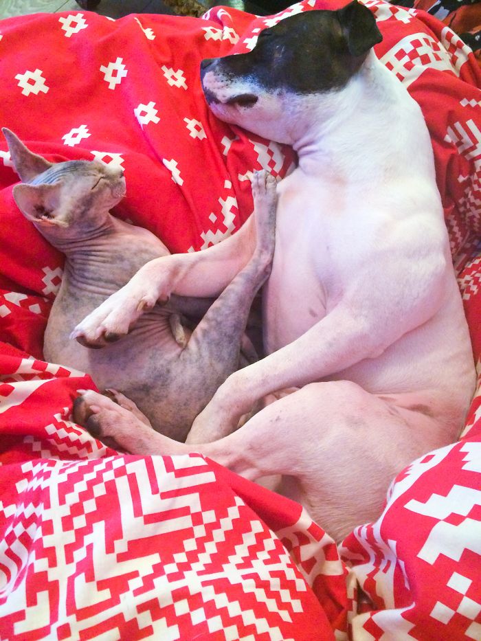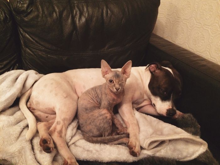 ▼貓咪和狗狗一起吃飯、睡覺、玩耍,形影不離。