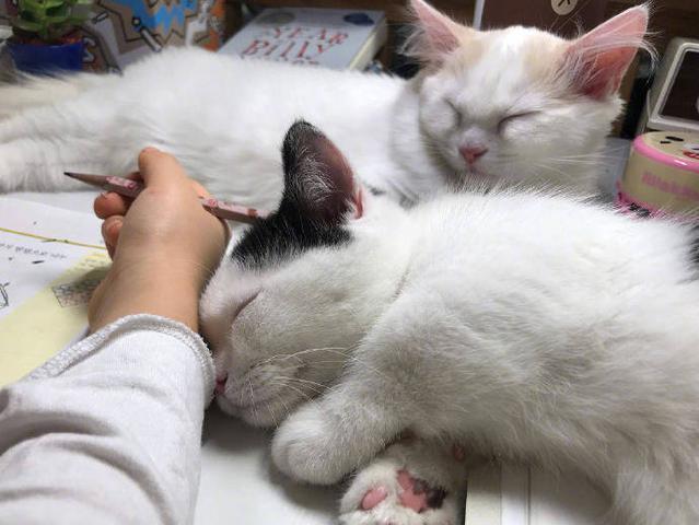 ▼兩隻貓咪頭靠著頭,睡姿非常愜意。牠們一點也不影響小主人,反而用小小的呼嚕聲給她加油打氣。