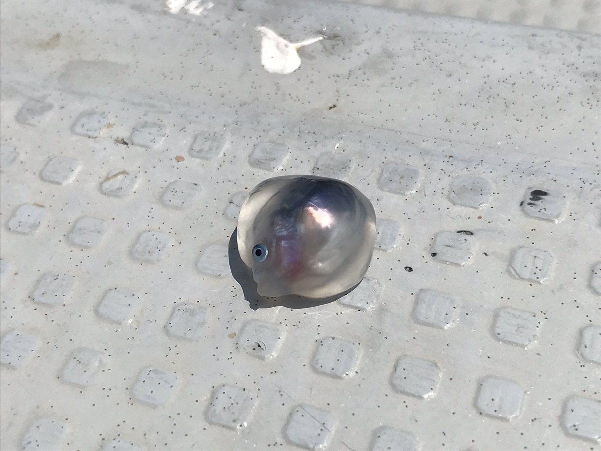 ▼照片中這只稚魚僅有小拇指頭大小,全身透明,鈴木龍之介表示,牠看起來像椰果一樣有嚼勁的感覺,摸起來像是果凍。