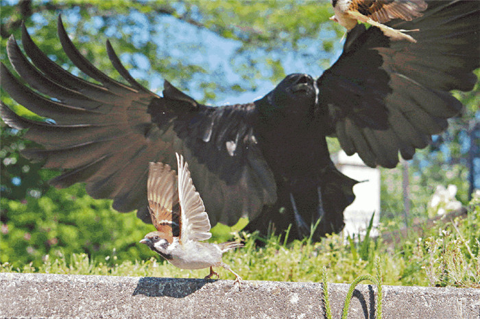 ▼一隻烏鴉從天而降,嚇壞了這隻小麻雀。