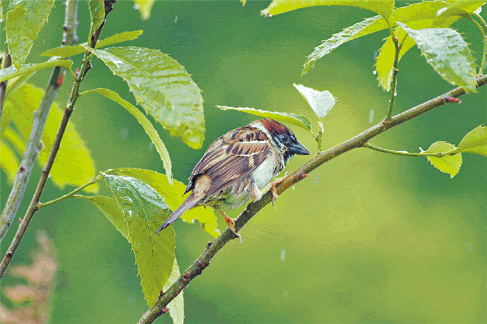 ▼在樹葉下躲雨。