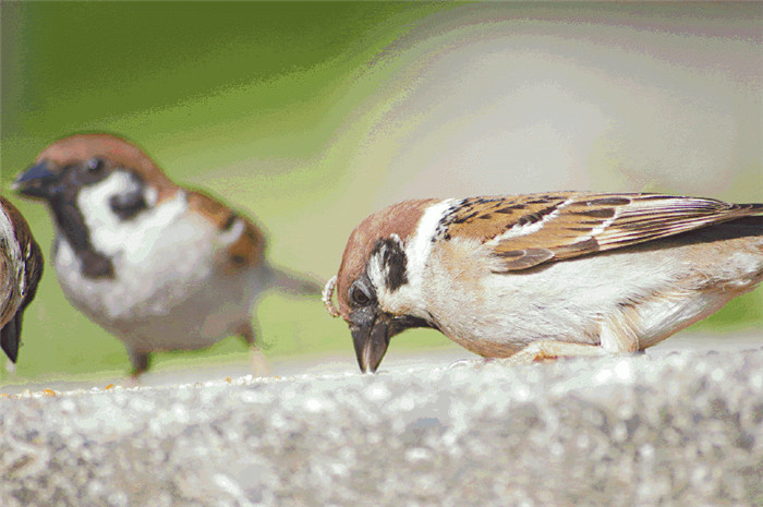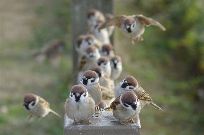 ▼隨著季節的變化,公園裡的麻雀數量也會有增有減,春天會有一半的麻雀離開公園去築巢繁殖,而夏天牠們又會帶著幼鳥回來,秋天,麻雀會飛到成熟的稻田中尋找食物,而冬天因為公園內的食物較多,牠們又會都聚集回來。最多的時候麻雀數量能有五百多隻,而最少的時候只有五十來隻。
