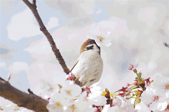 ▼一朵櫻花正好落在麻雀的頭上。