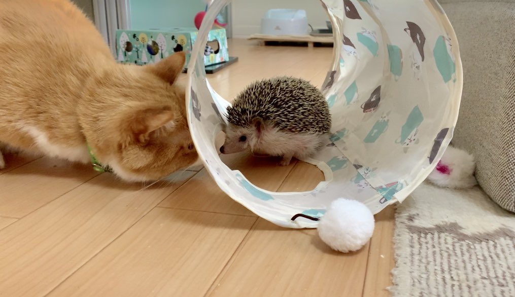 ▼@tikuwamaru0728養了一隻貓咪和一隻刺猬,每次貓咪經過刺猬身邊時,都會忍不住拍一下刺猬,這次也不例外。喵咪先是在一旁緊盯著刺猬,準備伺機而動。