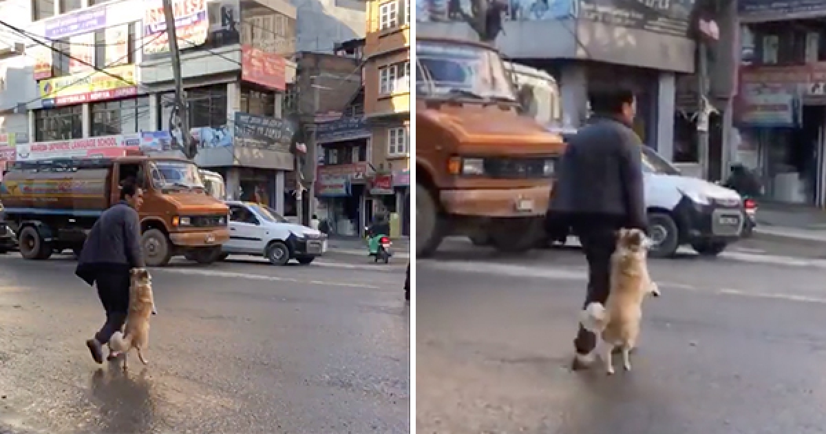 過馬路要小心哦~ 機靈汪伸爪「乖牽主人的手」跟著走