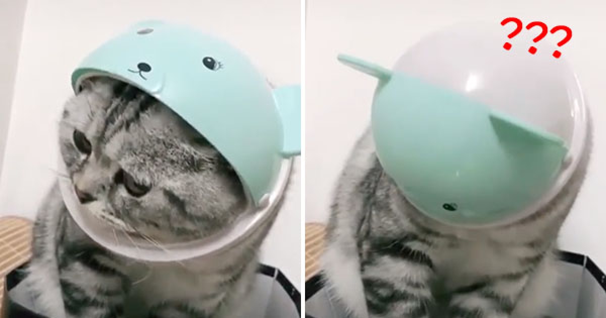 愛玩喵頭卡垃圾桶 下秒變「全罩式安全帽」大驚:鏟屎的~槓嘛關燈!