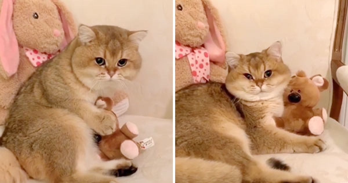 不准你搶走熊熊~胖萌英短貓抱緊娃娃 氣PUPU瞪馬麻:偶咬咬喔