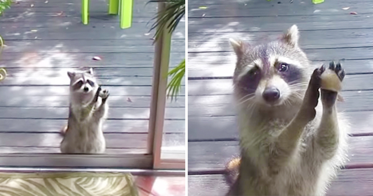 偷吃慣犯發現貓飼料沒了 浣熊直接拿石頭敲玻璃:喂~該補囉