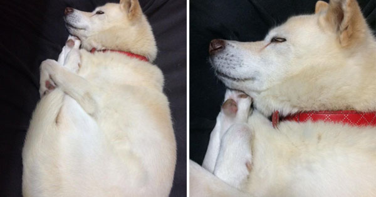 怎麼睡得著啦?白柴腳骨超軟Q 自抱成「菜頭」萌睡
