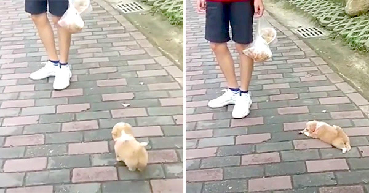 奶汪一路晃小短腿跟蹤食物 被抓包「立刻臥倒裝傻」:我只是路過啦~