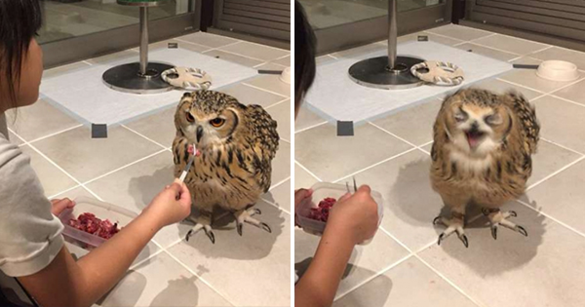 淡定鵰鴞一吃肉肉秒萌化 變「顏文字」興奮笑:太好吃啦~