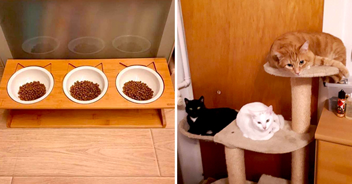 鏟屎官買3貓碗以為會乖乖分食… 一開飯「主子纏成麻花捲」臉看歪