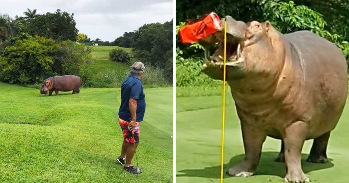 重量級選手駕到!河馬路過果嶺技癢 興奮叼旗:讓我也來一桿試試?