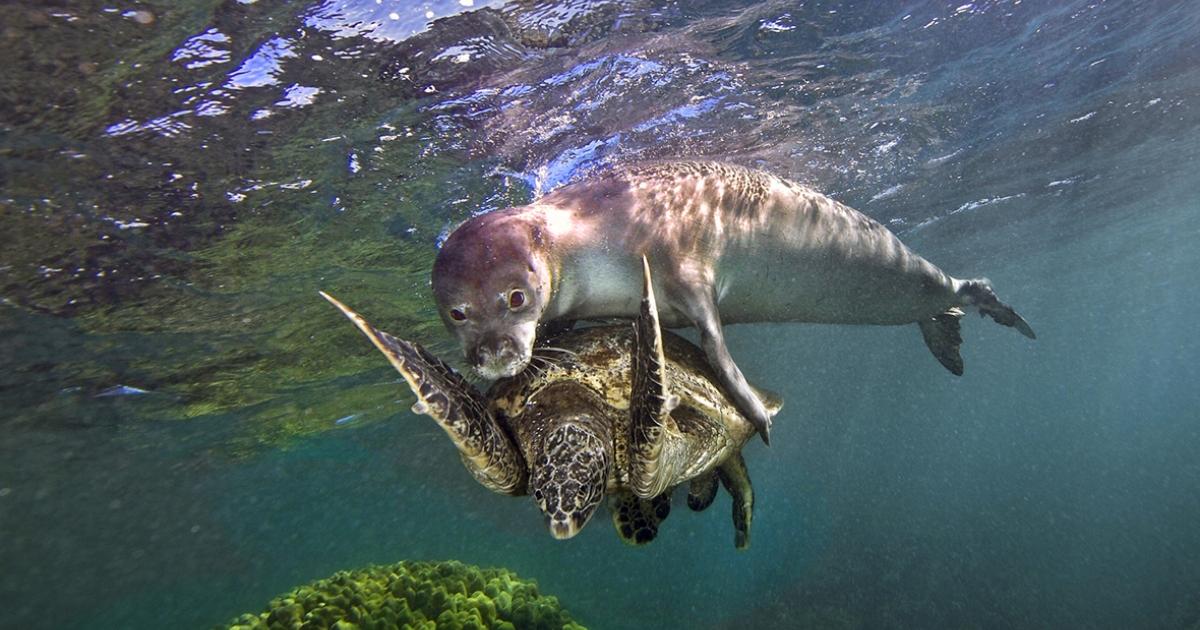 小海龜「被釣魚線纏住」動彈不得,小海豹看見…衝過來給牠「愛的抱抱」
