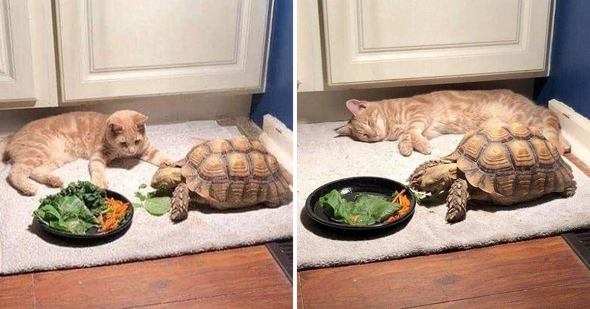 是要吃多久? 跟烏龜約好「吃完飯一起玩」 橘貓「等到度估」:我先睡一下