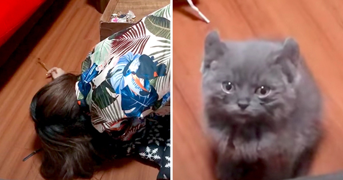 主人跪地逗貓「粗乃玩嘛」 畫面一轉喵皇很無奈:朕不在那邊…