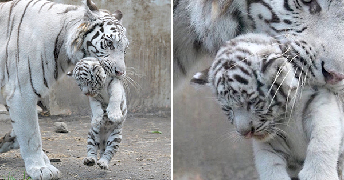 白虎媽下令「過來學用爪子」 屁孩小白虎還想玩…被叼走一臉氣噗噗