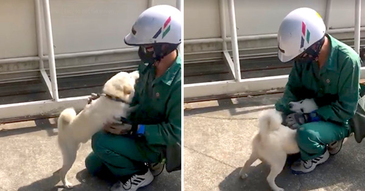 「聽到熟悉的引擎聲」好激動 小白柴秒撲郵差懷裡撒嬌:倫家好想泥啊~
