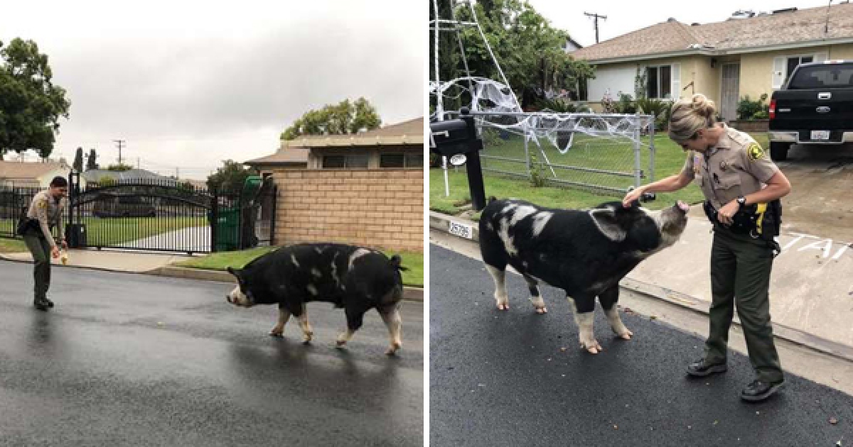 大豬在馬路上閒逛驚呆民眾 女警想出妙招誘惑:牠平安回家了~