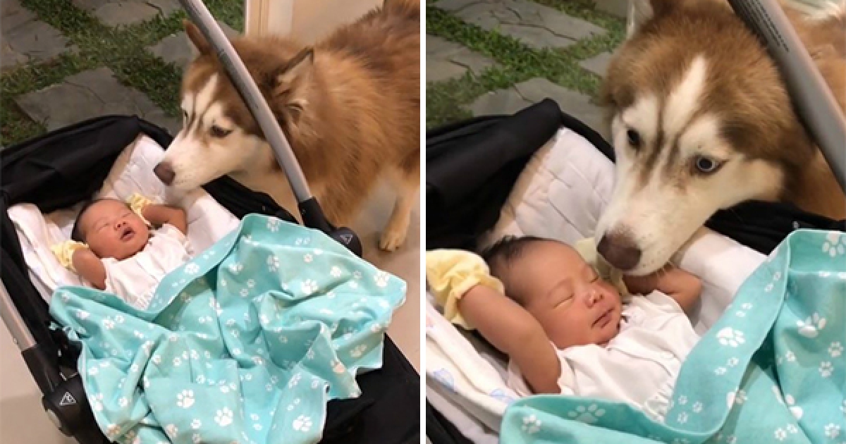 哈士奇初見「小主人寶寶」 默默的狂嗅氣味:好香啊~