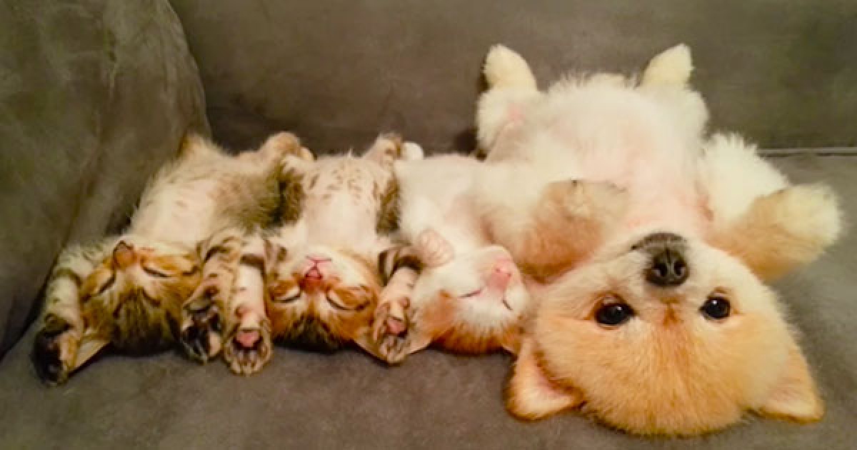 狗狗跟貓寶寶的睡姿神同步 一起秀出激萌肉球把網友都融化了