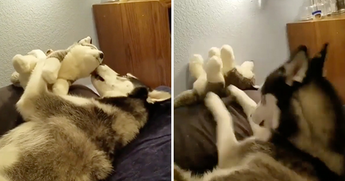 「你縮話啊!」 月月看哈士奇娃娃不回話 7pupu丟一旁:不跟你好了啦~