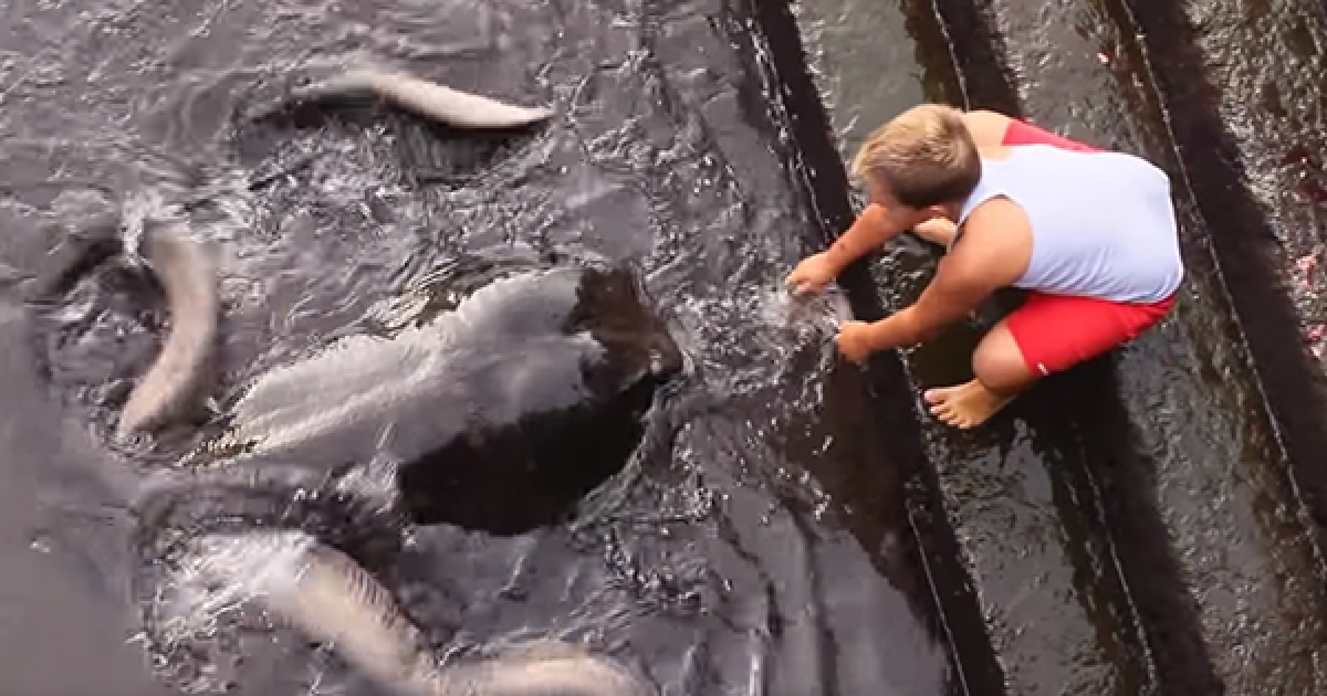 小男孩輕拍水面「召喚出寵物」 超巨大身影秒現身討食物吃