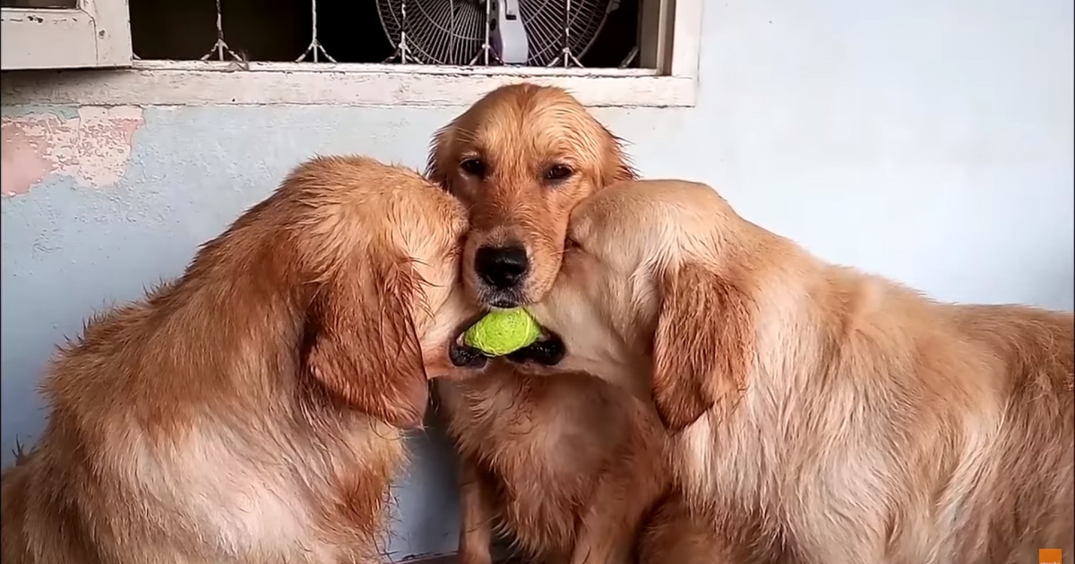 2隻金金爭球互不讓 3號金金跑來鬧:就看你們什麼時候放開~